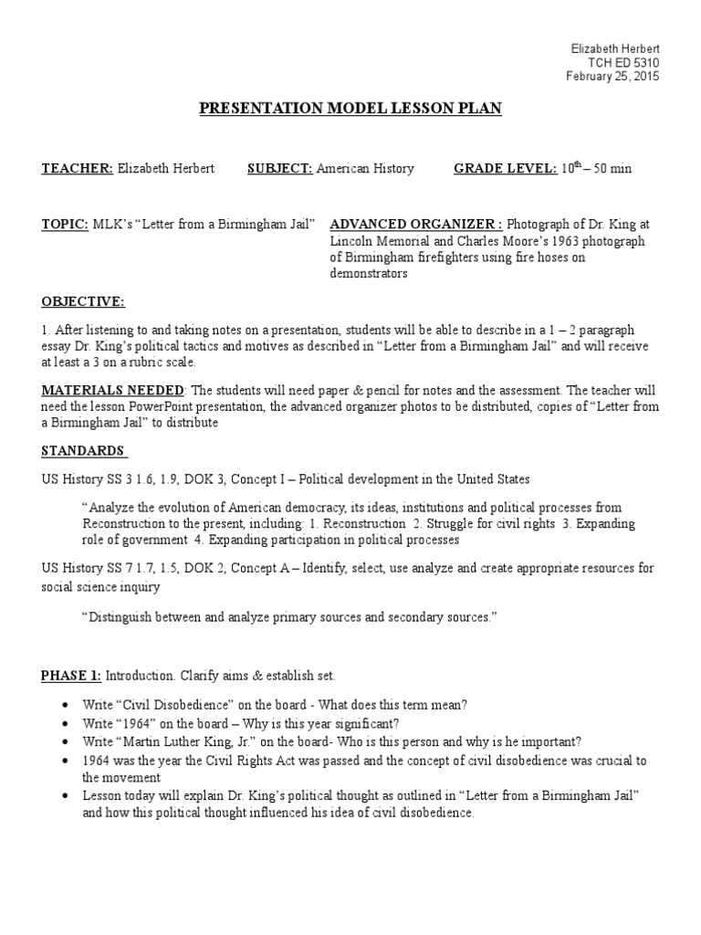 Lesson Plan On Birmingham Jail Civil Disobedience Martin Luther King Jr
