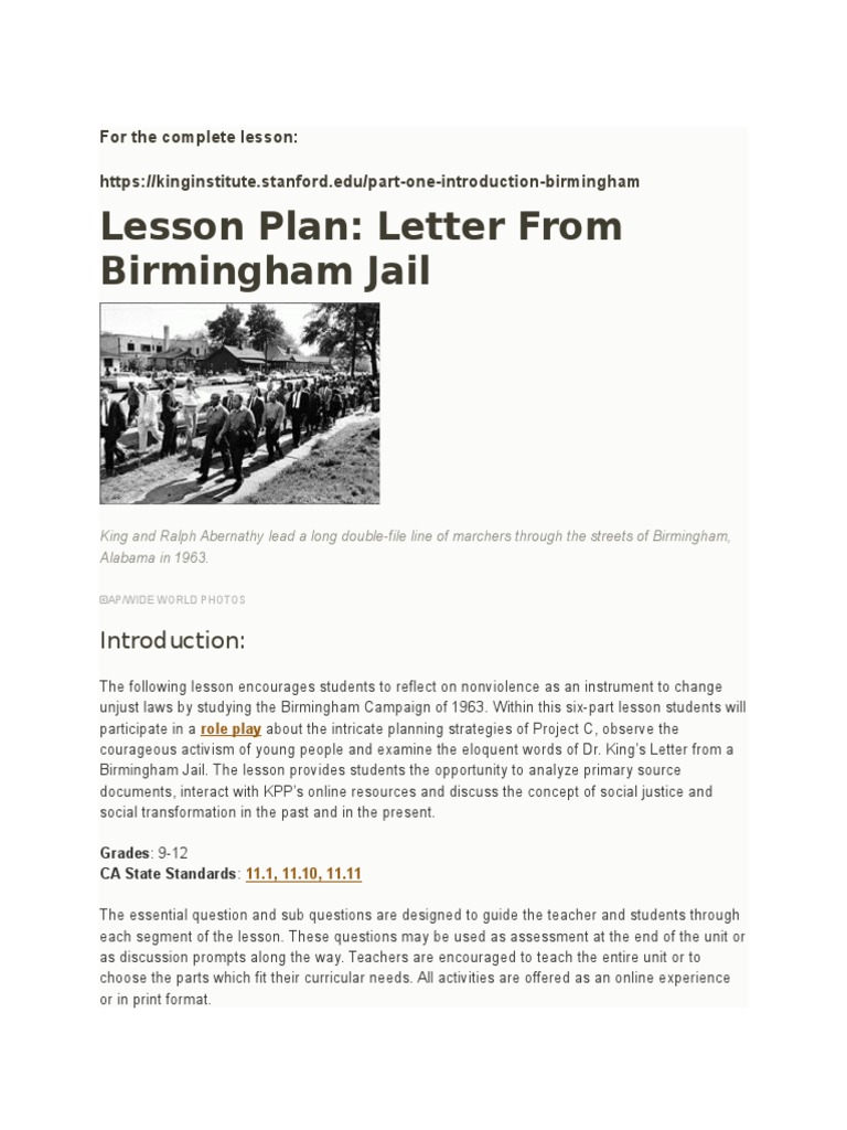 Lesson Plan Letter From Birmingham Jail The Power Of Nonviolent Direct Action The Martin Luther King Jr Research And Education Institute